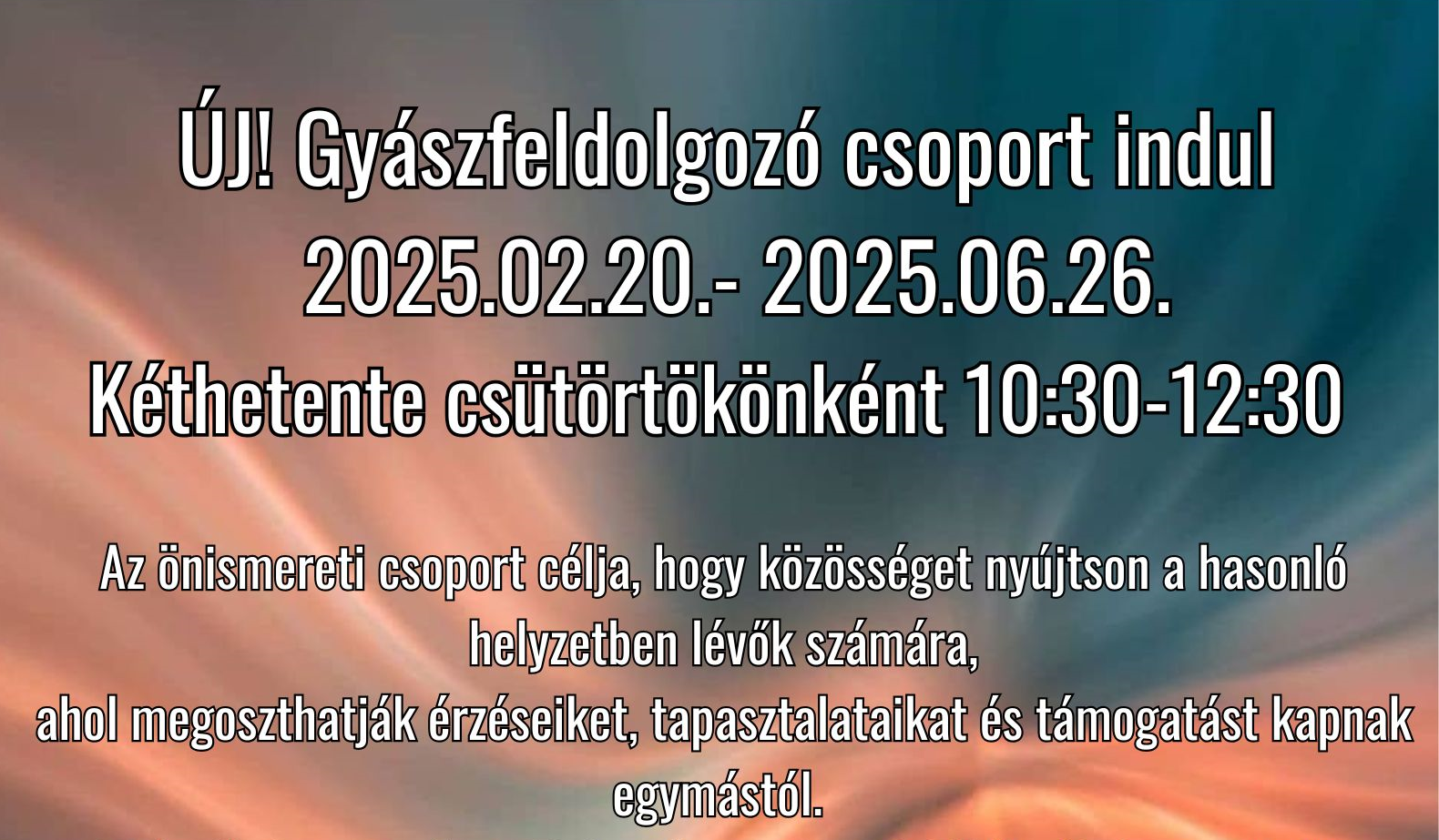 ÚJ! Gyászfeldolgozó csoport indul 2025.02.20.- 2025.06.26. között 10 alkalommal kéthetente. csütörtökönként 10:30-12:30 között.