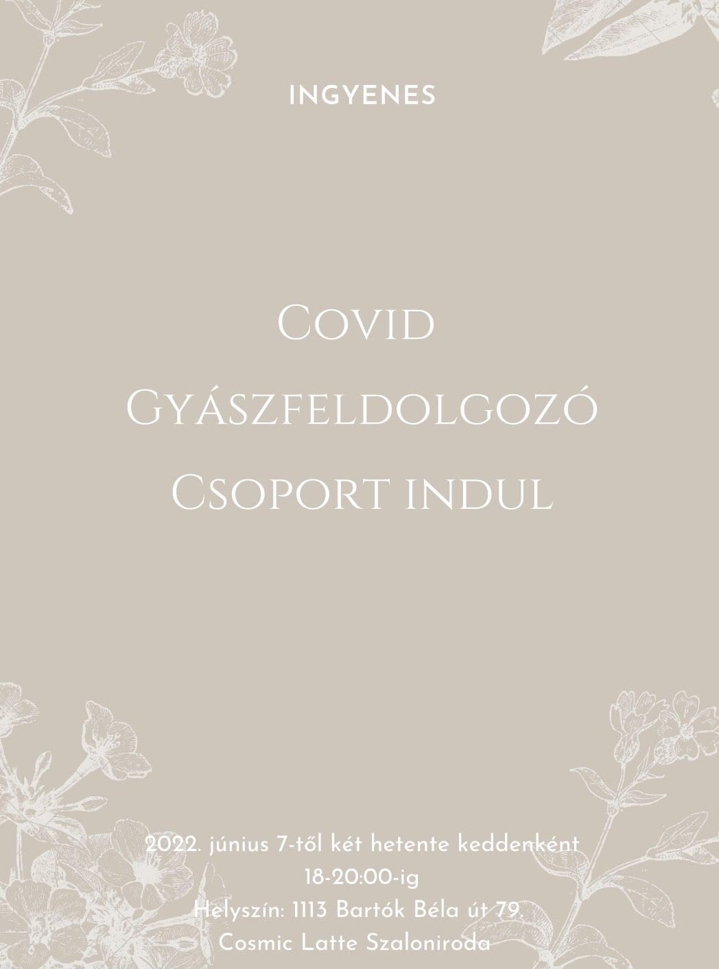 A csoportba várjuk mindazok jelentkezését, akik COVID által vesztették el szerettüket és támogatásra, vigasztalódásra vágynak. Csoportunk egy olyan közösség, ami a sorstársak támogató erejével csökkentheti fájdalmukat. A találkozások helyszíne: Cosmic Latte Szaloniroda 1113 Budapest, Bartók Béla út 79. Kéthetente keddenként 18:00-20:00-ig. Az alkalmak hossza csoportlétszámtól függően változhat. Tervezett időpontok: 2022. június 7. 2022. június 21. 2022. július 5. 2022. július 19. 2022. augusztus 2. 2022. augusztus 16. 2022. augusztus 30. 2022. szeptember 13. A csoport a második alkalom végén zárttá válik, a biztonságos légkör érdekében. Várható csoportlétszám: 6-10 fő Jelentkezni a megadott e-mail címen lehet, amit egy rövid ismerkedő beszélgetés követ online vagy telefonon, előre egyeztetett időpontban. E-mail cím:Üdvözlettel: