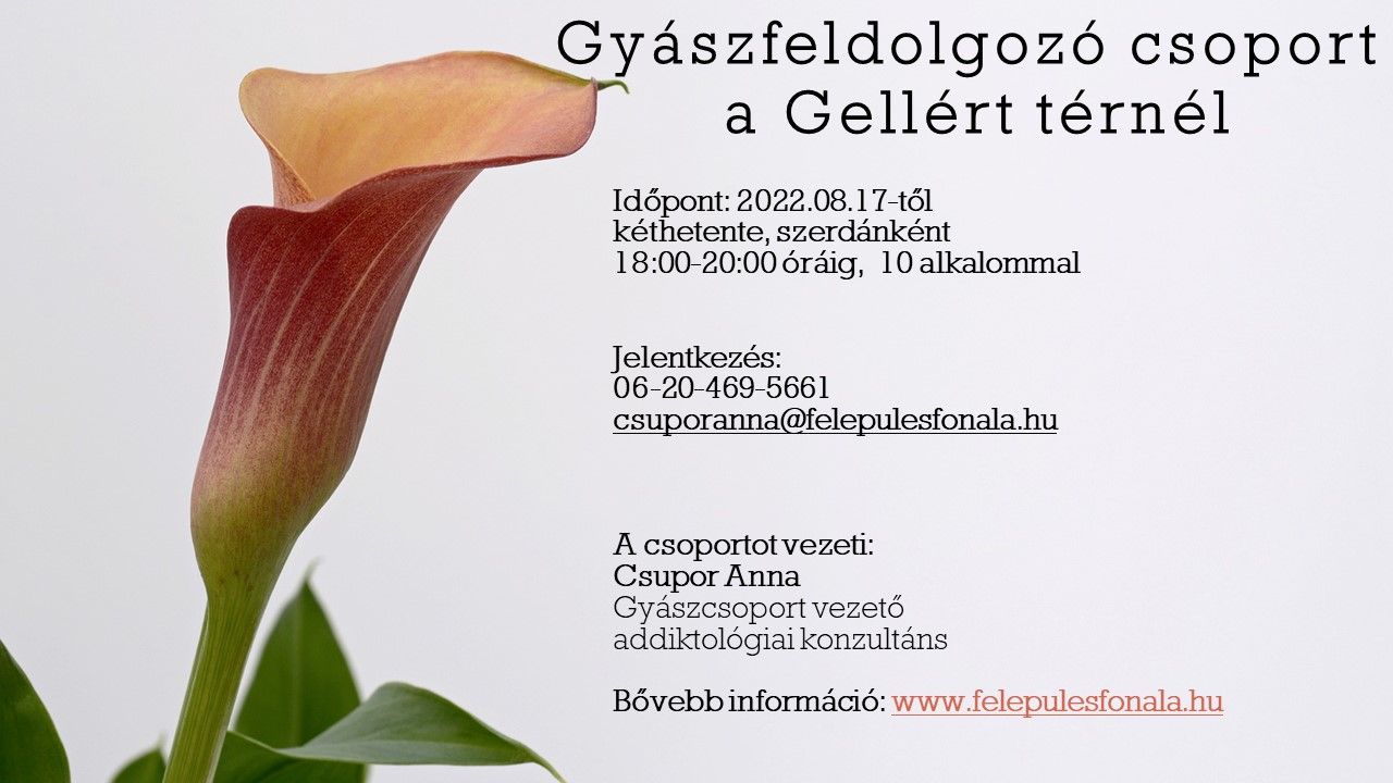 Csoportvezető: Csupor Anna gyászcsoport-vezető, addiktológiai konzultáns.