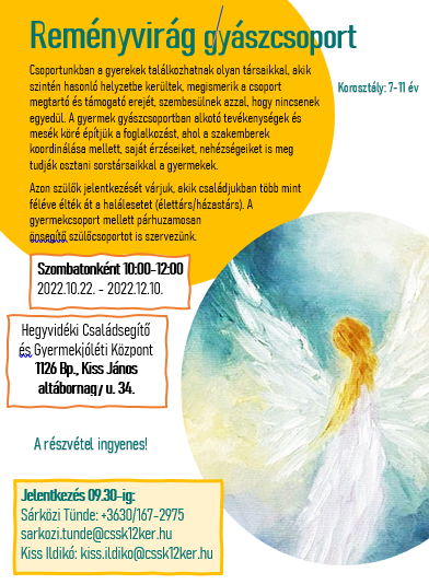 Azon szülők jelentkezését várjuk, akik családjukban több mint féléve élték át a halálesetet (élettárs/házastárs elvesztése). A gyermekcsoport mellett párhuzamosan önsegítő szülőcsoportot is szervezünk.
