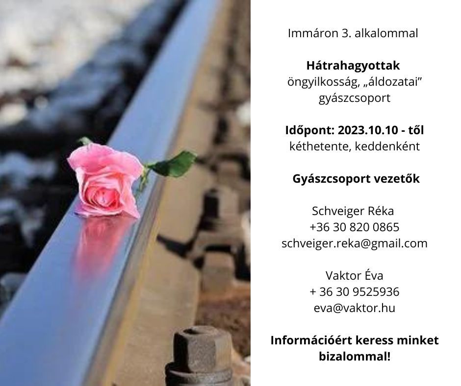 gyászfolyamatban. A Hátrahagyottak gyászcsoport egy igazi sorstárs csoport, ahol a Sorstársak a csoport munka során egymásnak is segítséget nyújtanak. Ha úgy érzed, nem találod a megnyugvást az öngyilkosságban elveszített Szeretted okán,