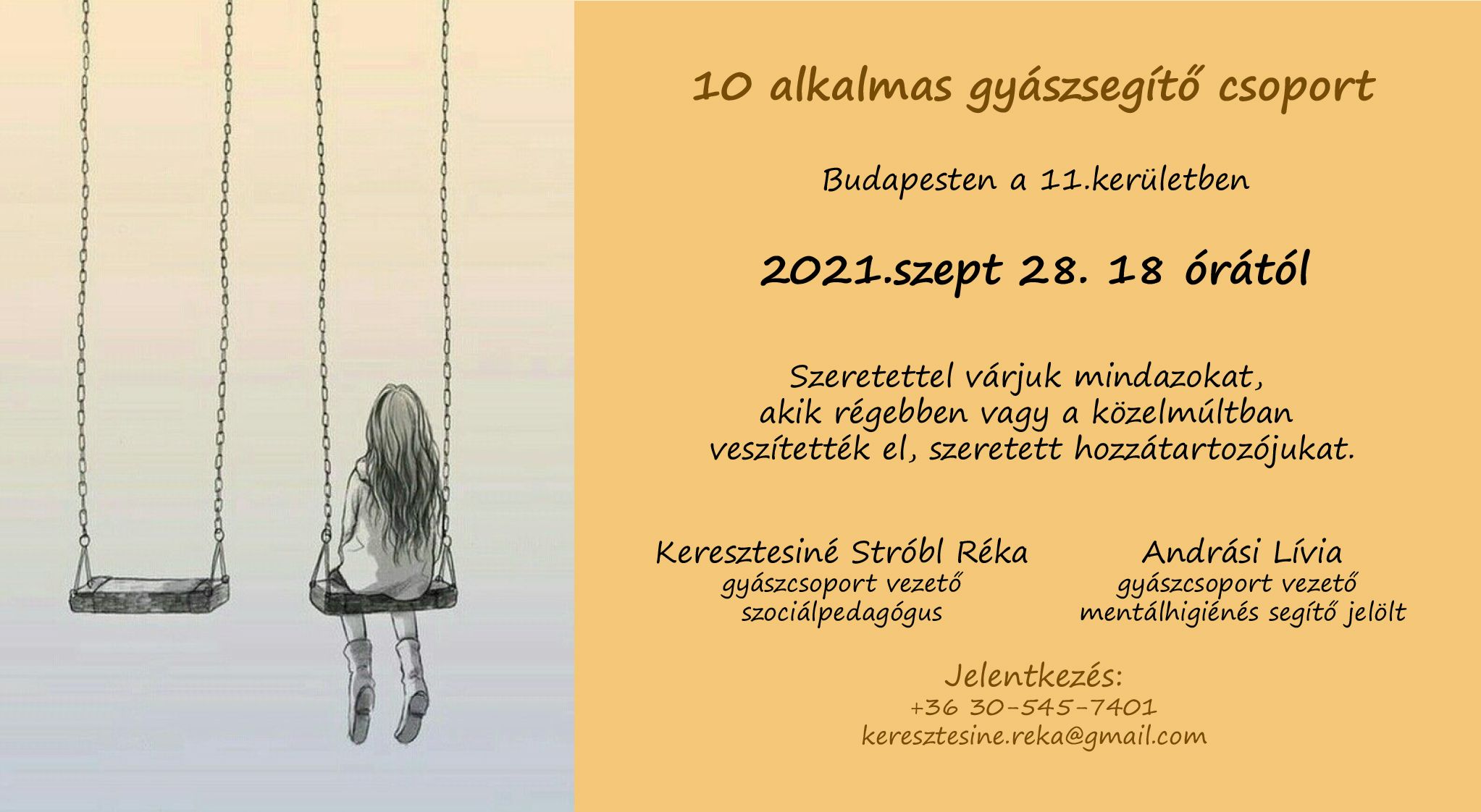 Csoportkísérők: Keresztesiné Stróbl Réka, gyászcsoport vezető, szociálpedagógus Andrási Lívia, gyászcsoport vezető, mentálhigiénés segítő jelölt Jelentkezés és további információ: +36 30- 545-7401